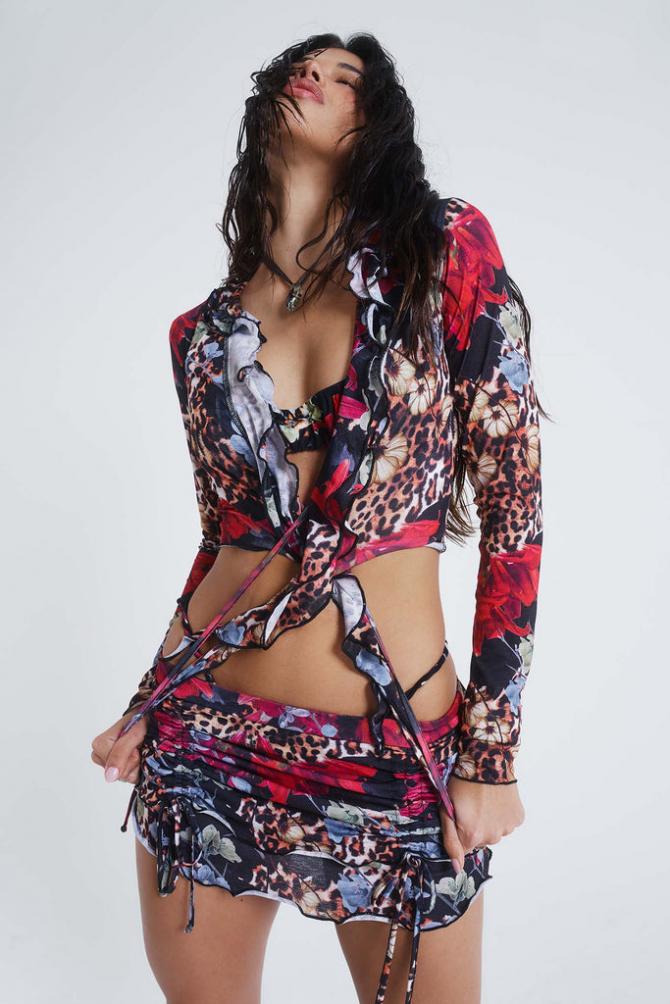 Descriptiondark Romantic Leopard Print Ruffle Neck Beach Shirt Matching Bikini & Skirt Available Product Code: Jst953