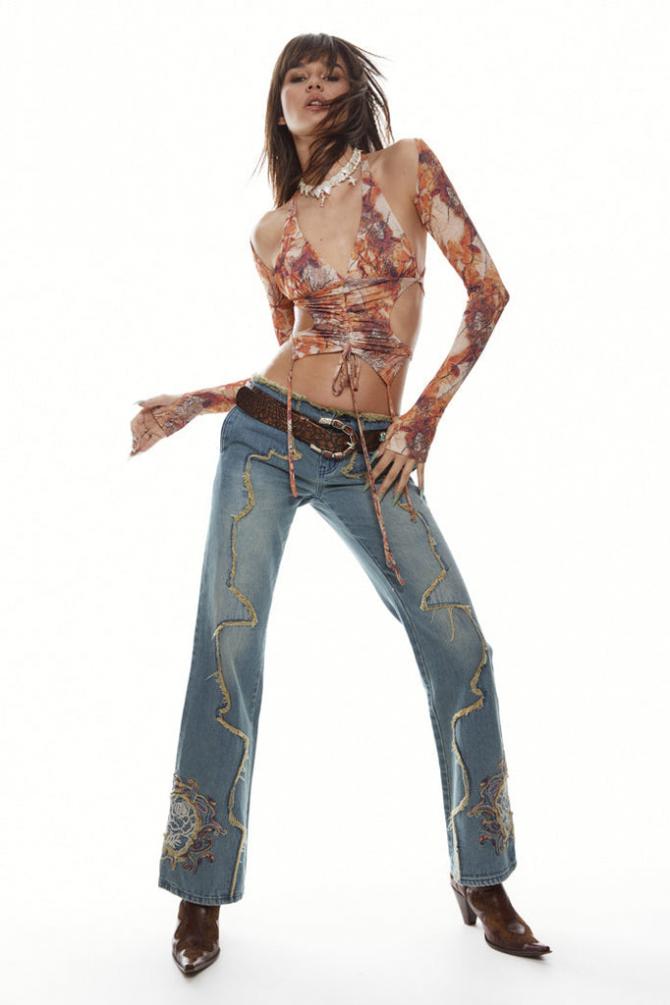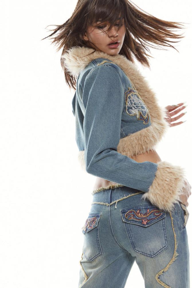 Descriptiony2K Cropped Denim Jacket With Faux Horn Toggle, Frayed Panel Detail & Flower Embroidery