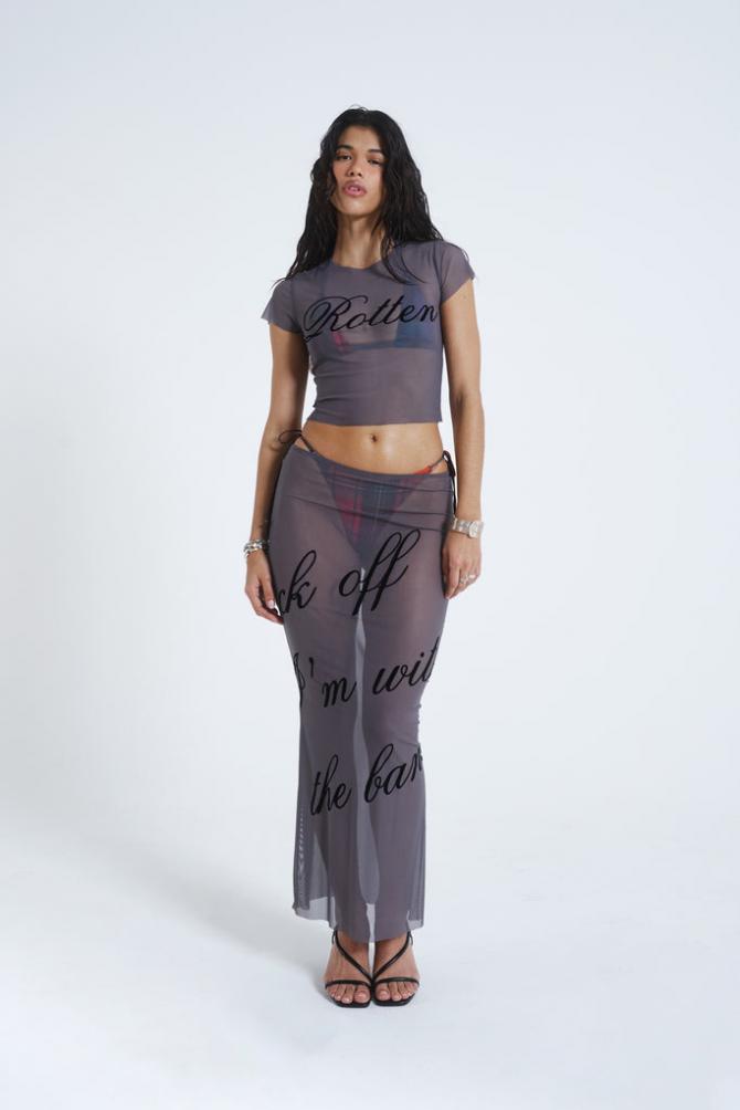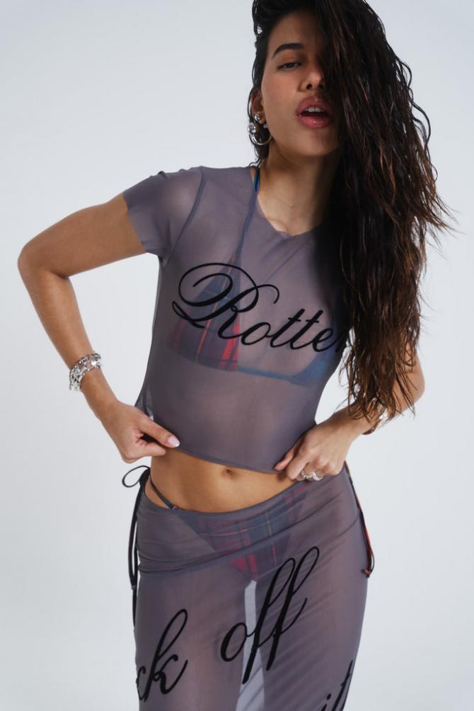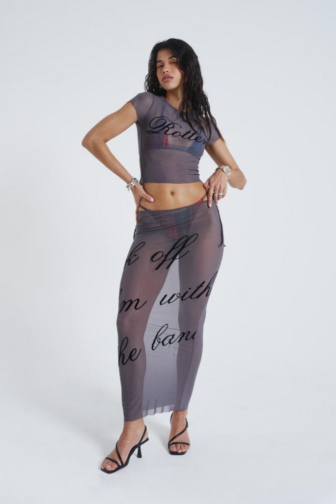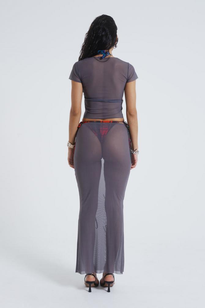 Descriptiongrey Mesh Baby Tee With Rotten Flock Placement Print Matching Beach Skirt Available Product Code: Jst962