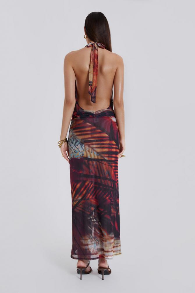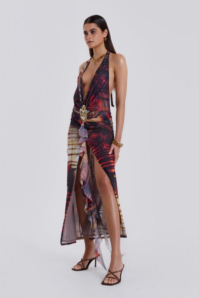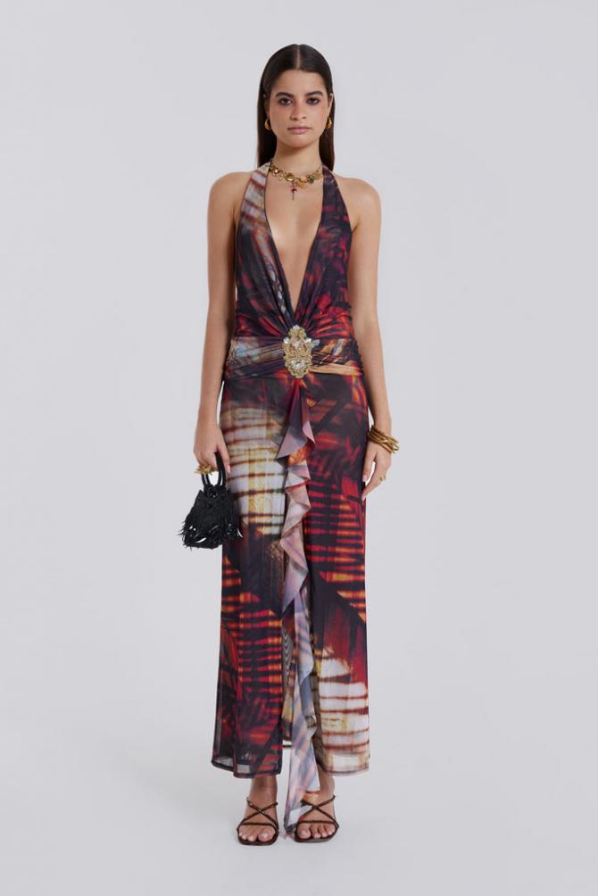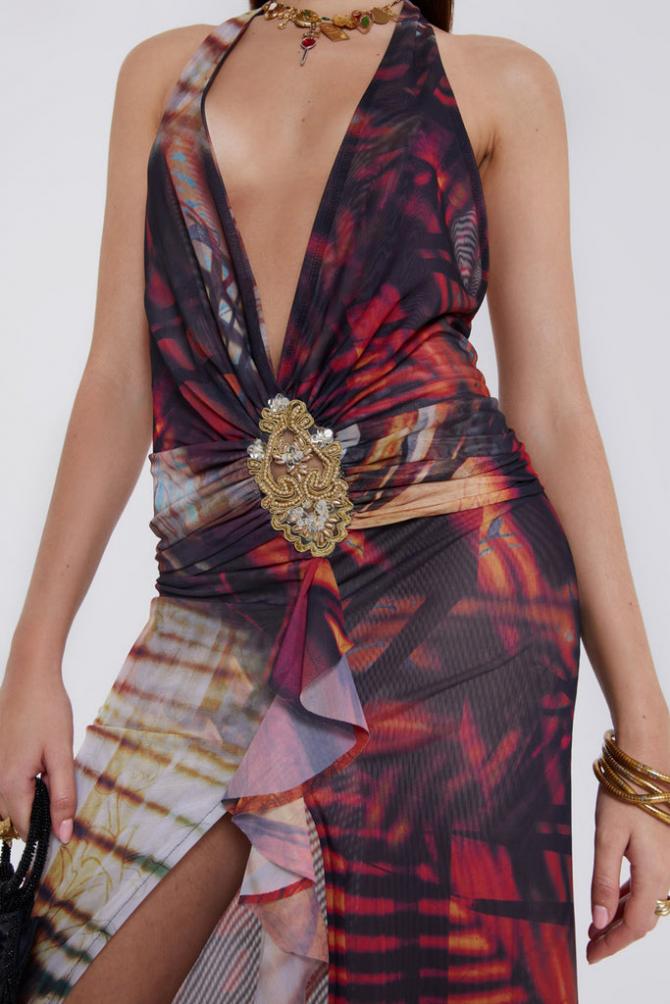 Descriptionbeach Sunset Oriental Print Plunge Halter Neck Dress With Front Split & Embroidery Trim Detail  Plunge Style Dress Halter Neck Detail Beaded Embroidered T…