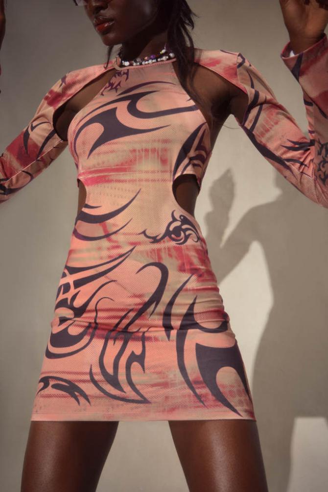 Descriptionabstract Tribal Print Long Sleeve Cut Out Jersey Dress