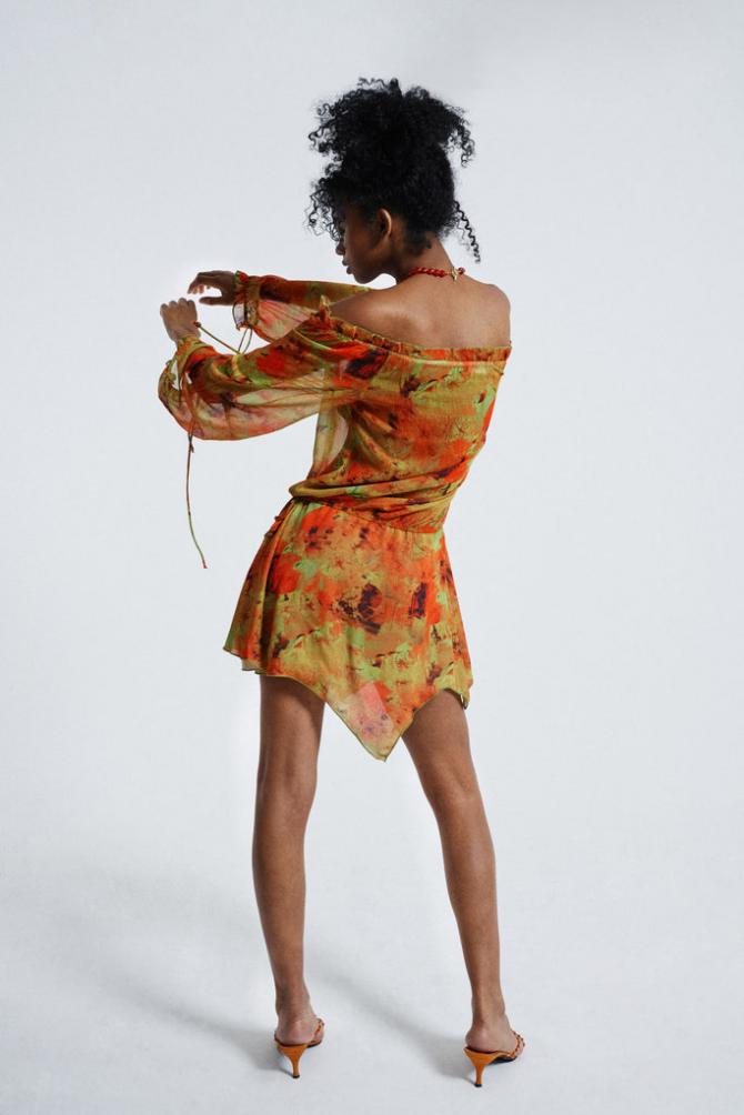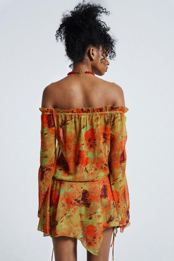 Descriptionisland Paradise Print Bardot Hanky Hem Mini Dress