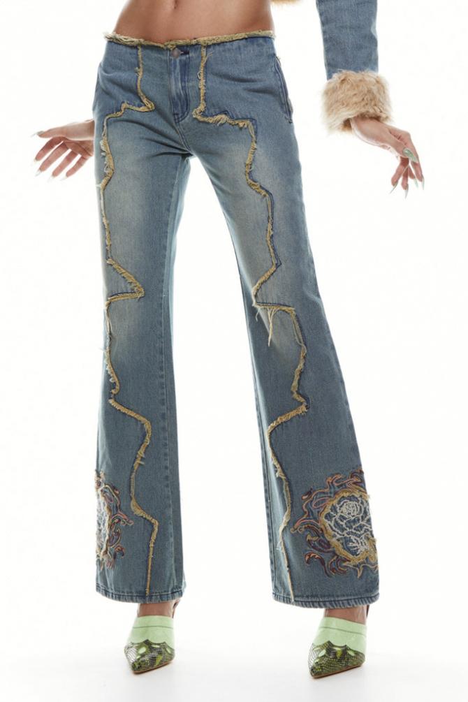 Descriptiony2K Extreme Low Rise Boyfriend Fit Jeans With Raw Waistband, Frayed Panel Detail & Flower Embroidery