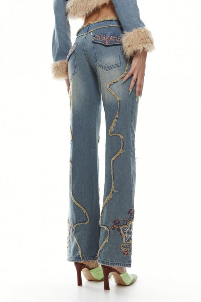 Descriptionpetite Y2K Extreme Low Rise Boyfriend Fit Jeans With Raw Waistband, Frayed Panel Detail & Flower Embroidery