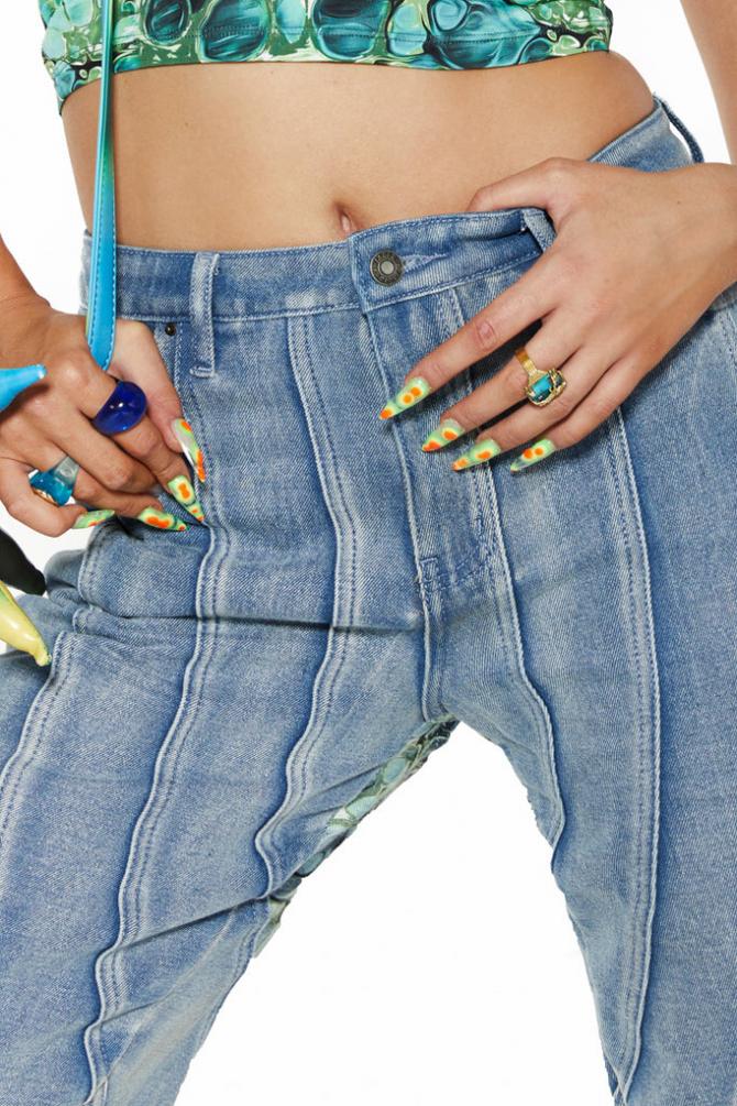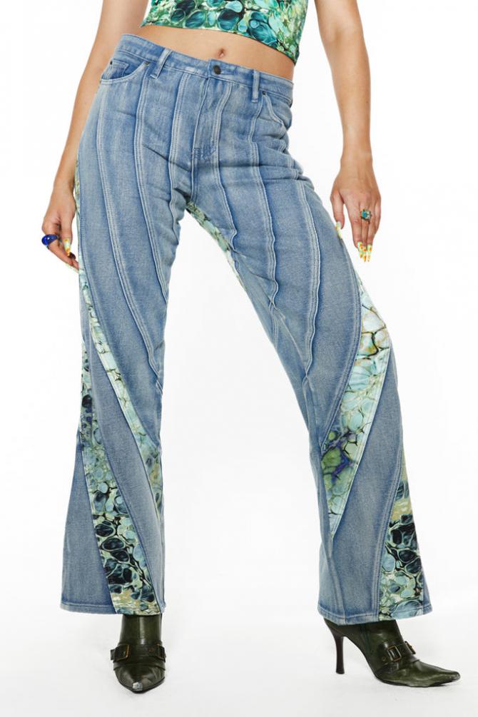 Descriptiongreen Organism Print Thong Detail Warped Seam Jeans With Printed Panels