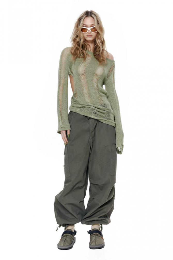 Descriptionkhaki Backless Long Sleeve Laddered Knit Mini Dress