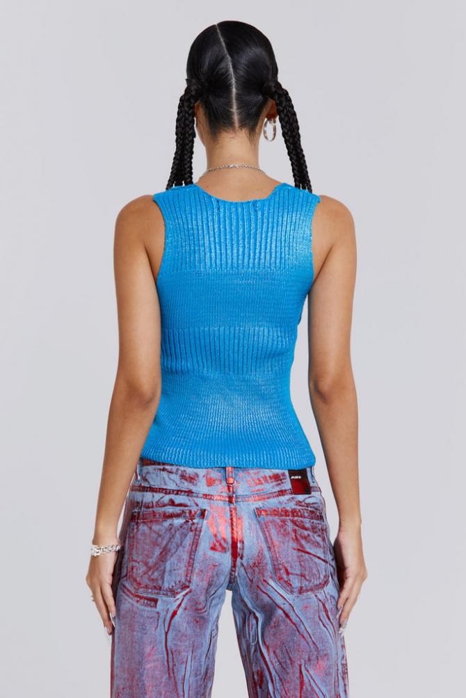 Descriptionblue Metallic Knitted Sliced Top Blue Metallic Foiled Chunky Knit Cast Off Edges Sliced Style Top V-Neck Sleeveless C…