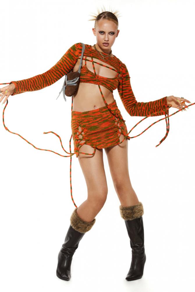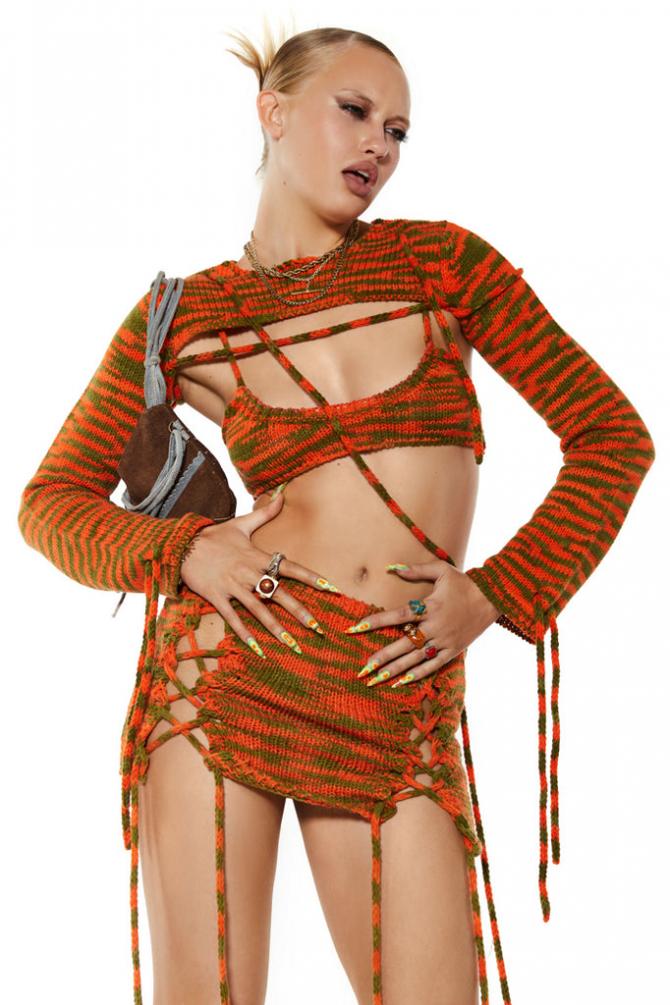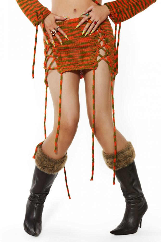 Description Chunky Green & Orange Knit Lace Up Detail Mini Skirt  Matching Top Available  Chunky Green & Orange K…