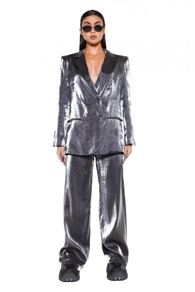Descriptionsilver Liquid Metal Satin Oversized Double Breasted Suit Jacket