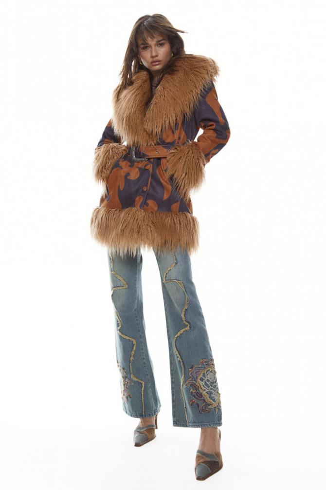 Descriptionshawl Collar Faux Suede And Faux Shearling Coat With Belt In Western Print Afghan Style Coat  Faux Fur Collar, Cuff & Hem Detail  Button Up Front  Midi Length  Western Belt Detail  Large Scale P…