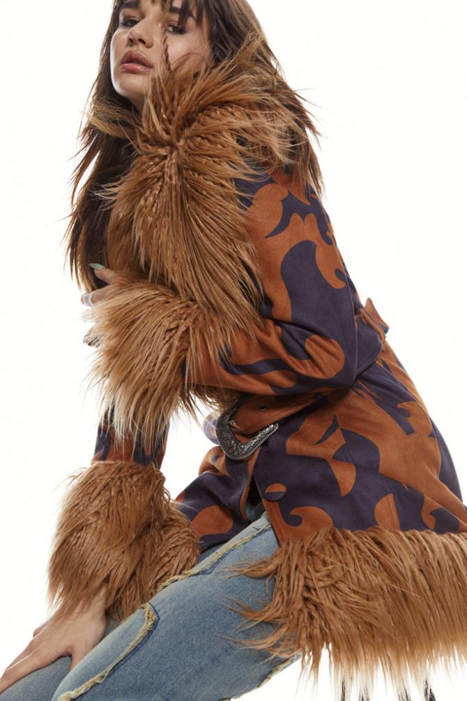 Descriptionshawl Collar Faux Suede And Faux Shearling Coat With Belt In Western Print