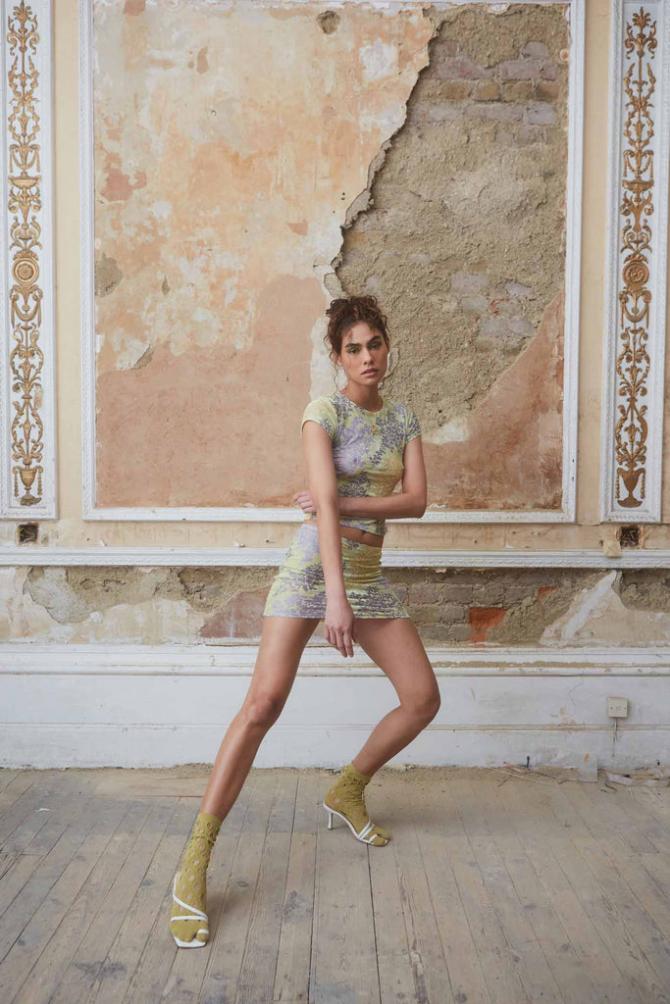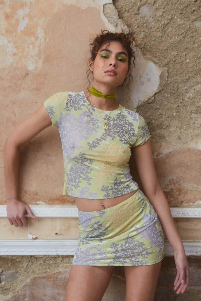 Descriptionblue & Yellow Devore Mini Skirt Matching Top Available Blue & Yellow Devore Velour Print Mini Length Part …