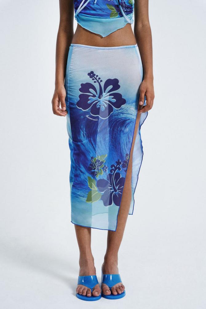 Descriptionblue Hawaiian Surf Floral Print Mesh Maxi Skirt