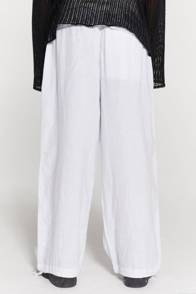 Descriptionwhite Wide Leg Linen Trousers X3 Pocket Stylingelasticated Waistband W/ Cotton Drawcordmetal Zip Fly Fasteningconcealed Button Closureinternal Drawcord At Cuffinside Leg Measures 63Cm